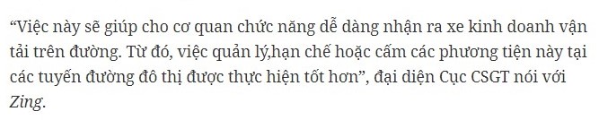 Việc thay đổi nhằm giúp cơ quan chức năng dễ dàng nhận ra đâu là xe kinh doanh vận tải, từ đó sẽ giúp cho việc quản lý tốt hơn, hạn chết hoặc cấm các phương tiện vận tải đi vào các tuyến đường cấm.